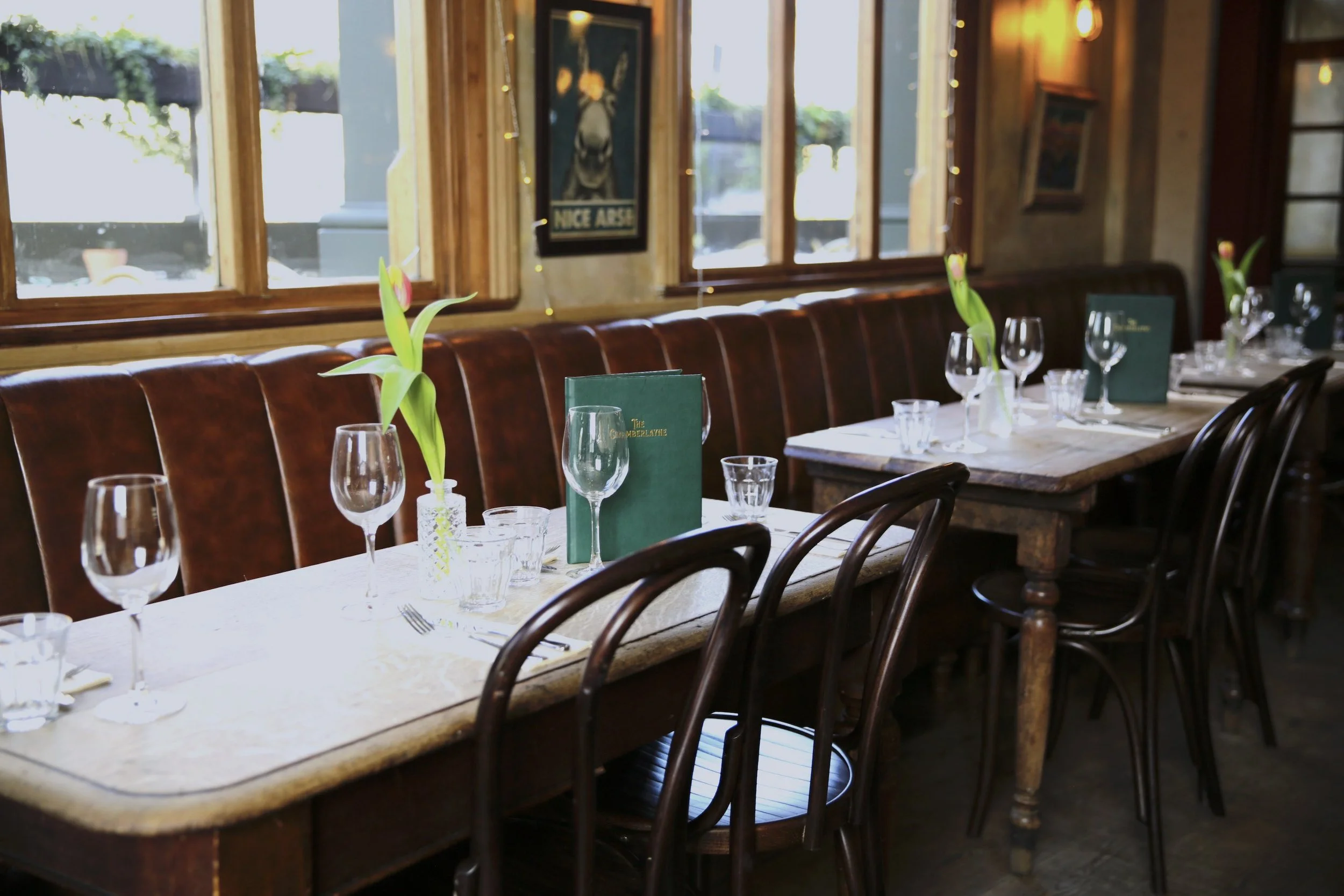 Enjoy a light & airy setting at these tables by the window, perfect for watching the world go by. A lovely spot for brunch or catching up with friends over a long dinner. We can seat up to 20 guests here.